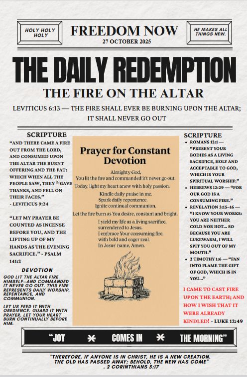 Holy, Holy, Holy. We welcome you to The Daily Redemption publication for the 27th of October, 2025. Today’s theme: The Fire on the Altar. Leviticus 6:13 declares: “The fire shall ever be burning upon the altar; it shall never go out.” This is not symbolic fire. It was lit by God Himself—and it was never to be extinguished.