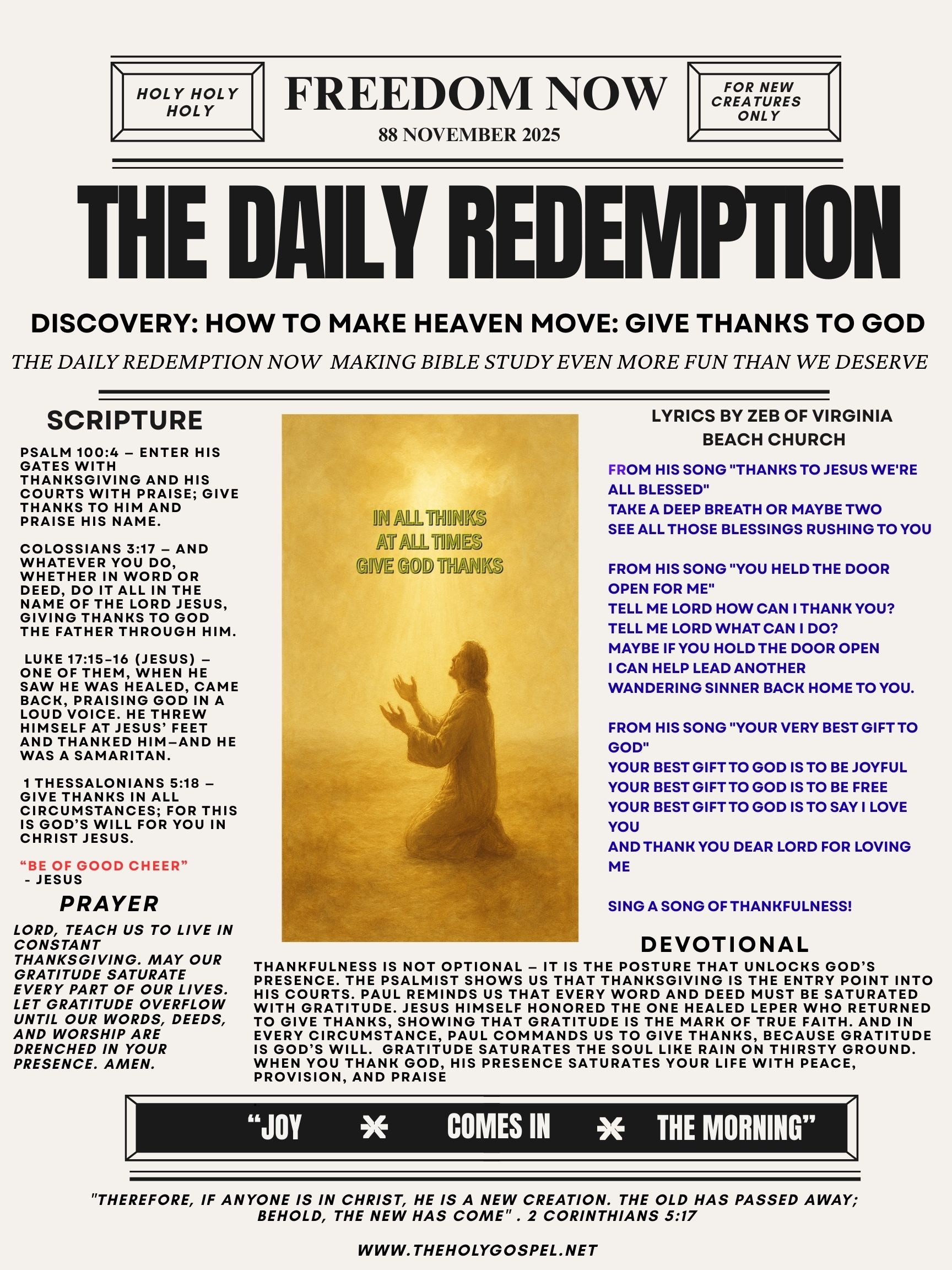 Holy Holy Holy. We welcome you to The Daily Redemption publication for November 28, 2025 provided by Zeb of Virginia Beach Church. Today’s Headline