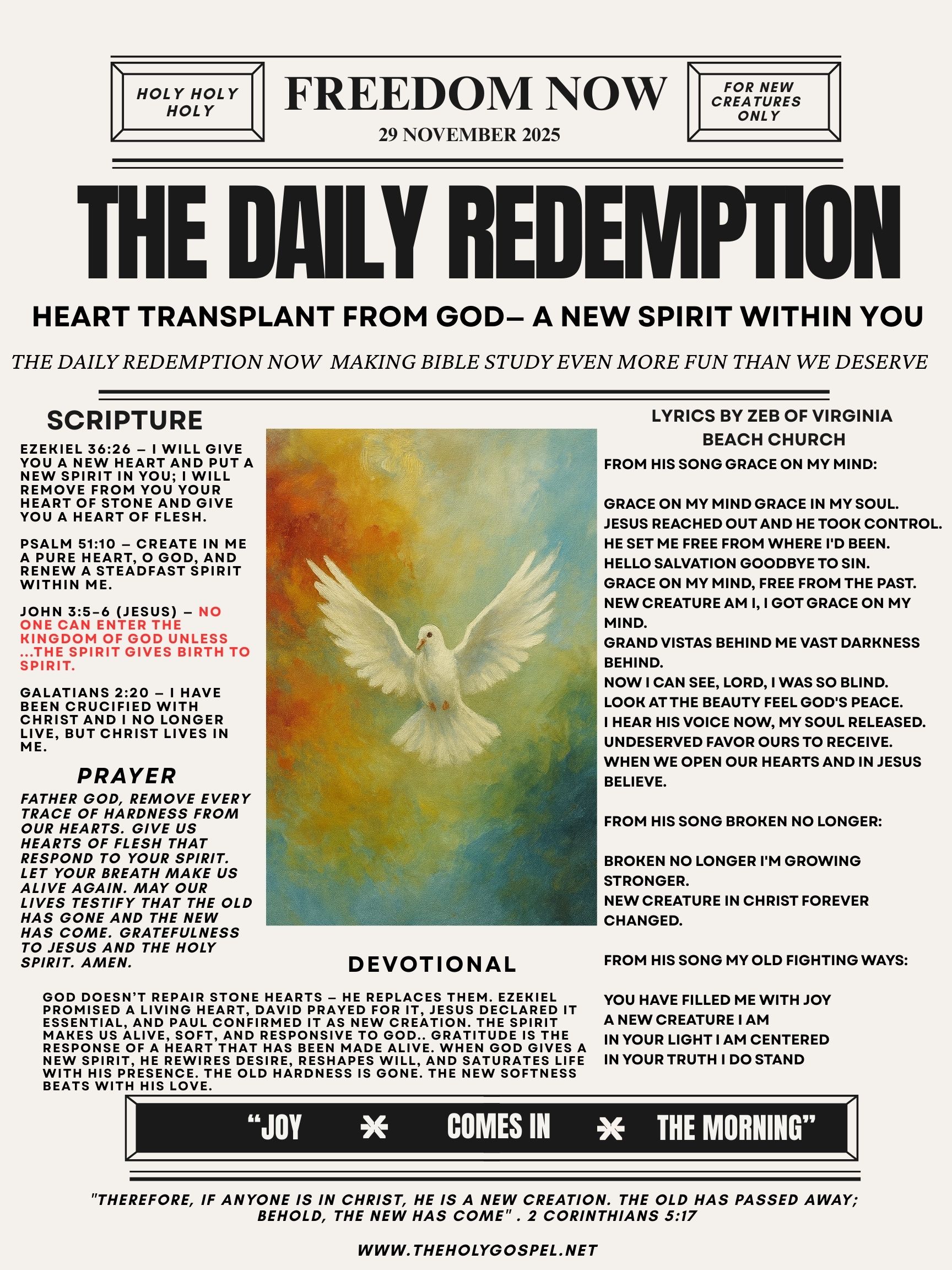 Holy Holy Holy. Welcome to The Daily Redemption Bible Bulletin of November 29, 2025, provided by Zeb of Virginia Beach Church and theholygospel.net. . Today’s theme and title is HEART TRANSPLANT from God — A NEW SPIRIT WITHIN YOU. Ezekiel 36:26 declares, I will give you a new heart and put a new spirit in you; I will remove from you your heart of stone and give you a heart of flesh. Psalm 51:10 prays, Create in me a pure heart, O God, and renew a steadfast spirit within me. Jesus in John 3:5–6 teaches, Very truly I tell you, no one can enter the kingdom of God unless they are born of water and the Spirit. Flesh gives birth to flesh, but the Spirit gives birth to spirit. Galatians 2:20 proclaims, I have been crucified with Christ and I no longer live, but Christ lives in me.