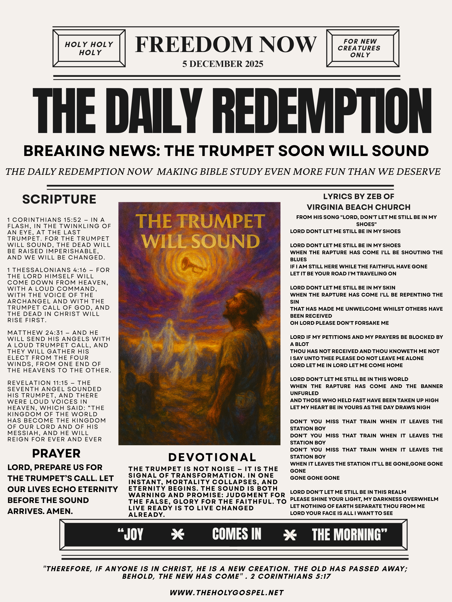 Holy Holy Holy. We welcome you to The Daily Redemption publication for December 5, 2025. Today’s headline: The Trumpet Will Sound — 1 Corinthians 15:52