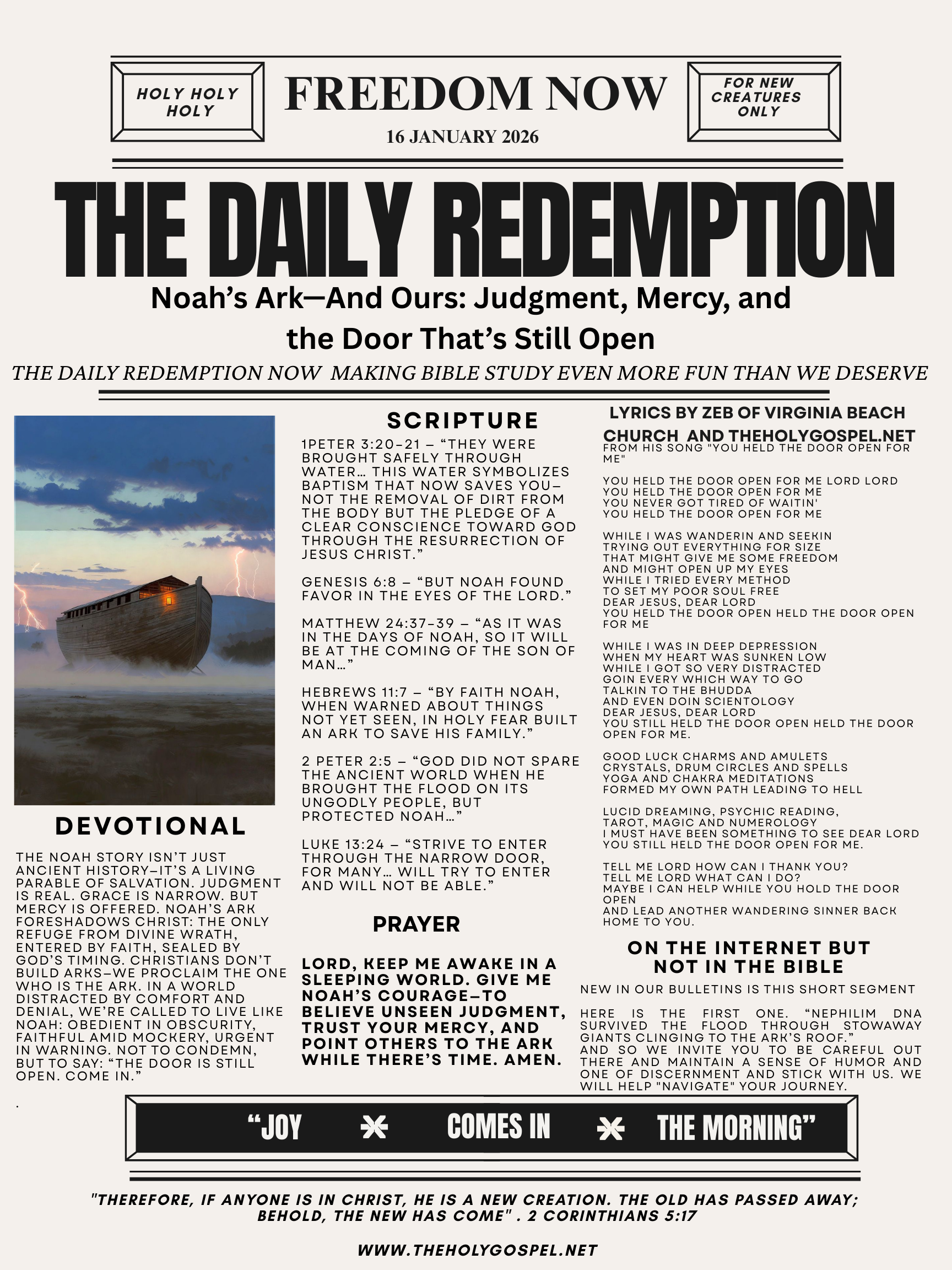 The Noah story isn’t just ancient history—it’s a living parable of salvation. Judgment is real. Grace is narrow. But mercy is offered. Noah’s ark foreshadows Christ: the only refuge from divine wrath, entered by faith, sealed by God’s timing. Christians don’t build arks—we proclaim the One who is the Ark. In a world distracted by comfort and denial, we’re called to live like Noah: obedient in obscurity, faithful amid mockery, urgent in warning. Not to condemn, but to say: “The door is still open. Come in.”