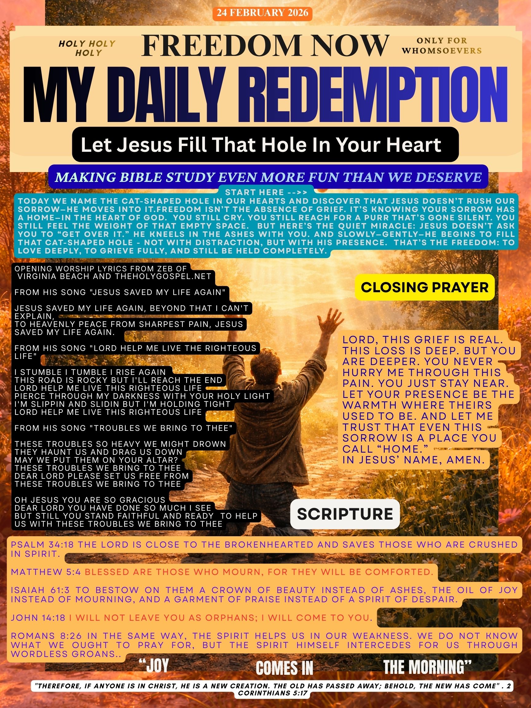 Welcome to The Daily Redemption for Tuesday, February 24, 2026 — where we name the cat-shaped hole in our hearts and discover that Jesus doesn’t rush our sorrow—He moves into it.