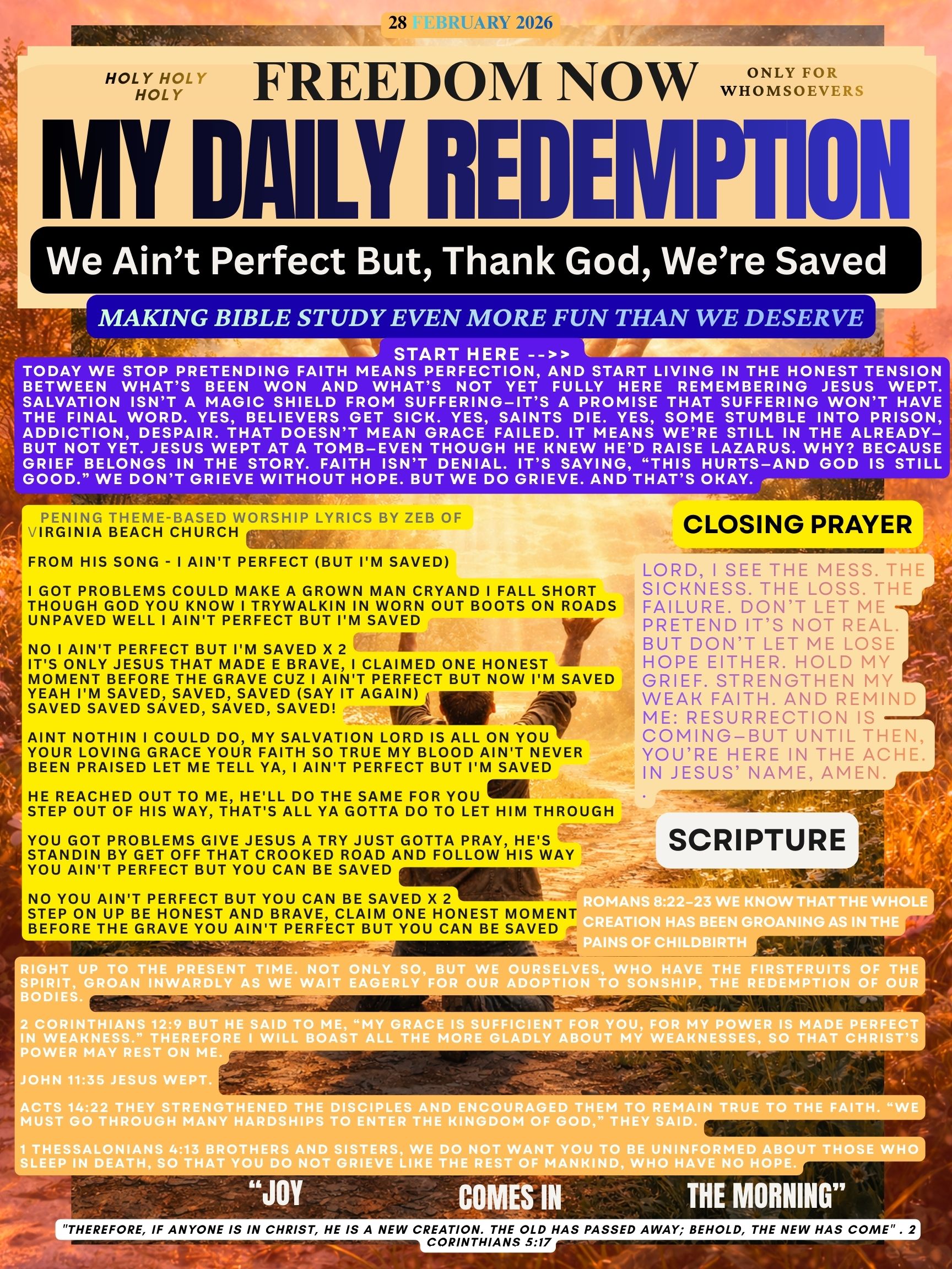 Welcome to The Daily Redemption for Friday, February 27, 2026 — where we stop pretending faith means perfection, and start living in the honest tension between what’s been won and what’s not yet fully here. Yeah, we’re saved. But we still get sick. Saints still die. Brothers still fall. And that’s not hypocrisy—that’s humanity. Jesus didn’t promise a pain-free life. He promised His presence in the pain. We grieve—but not like those with no hope. We struggle—but not alone. Because the same God who raised Lazarus wept at his grave. So bring your questions. Bring your doubts. Just don’t bring your pretense. Text on screen: “We groan inwardly as we wait…” — Romans 8:23. Dig deeper with more scripture, devotional content, and even song lyrics—and to pray and praise the Lord with us at The Daily Redemption Bible Bulletins, home of scripture-centered stories at theholygospel.net. If this gave you permission to be honest before God, we’d be honored if you’d like and subscribe—then join us again tomorrow. And as always, have a blessed day in the Lord.