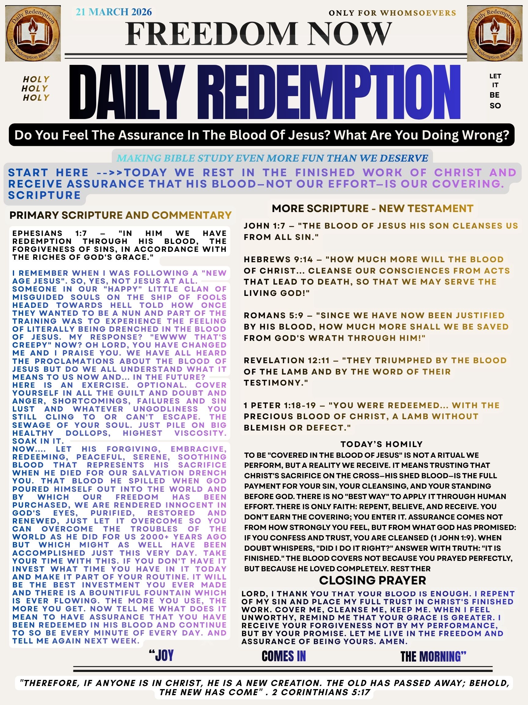 Discoverability Hashtags: #DailyRedemption #OnlyJesus #BloodOfJesus #Redemption #AssuranceOfSalvation #GraceUponGrace #FaithNotWorks #TheHolyGospel