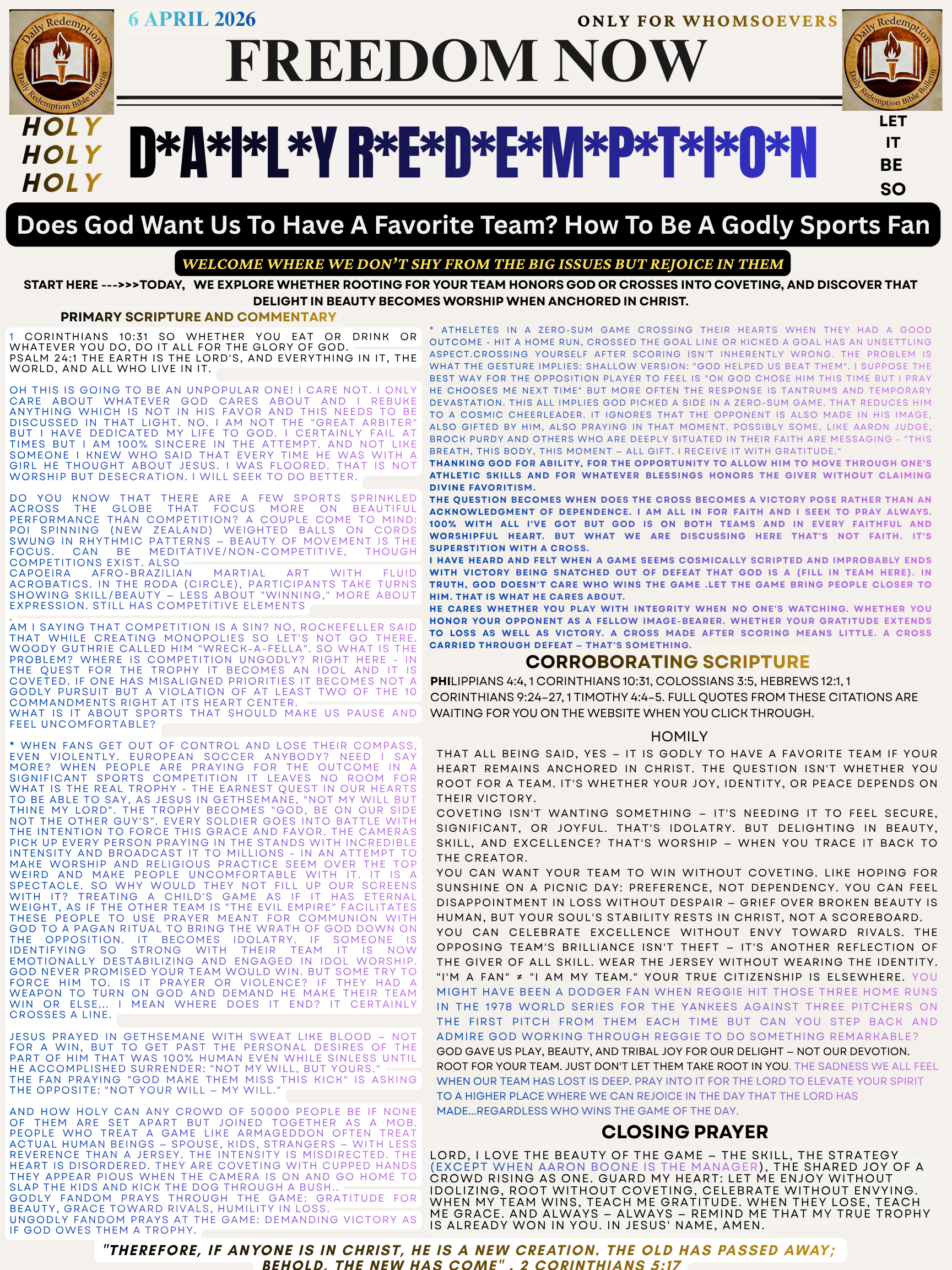 Welcome to today’s Daily Redemption — where we explore whether rooting for your team honors God or crosses into coveting, and discover that delight in beauty becomes worship when anchored in Christ.