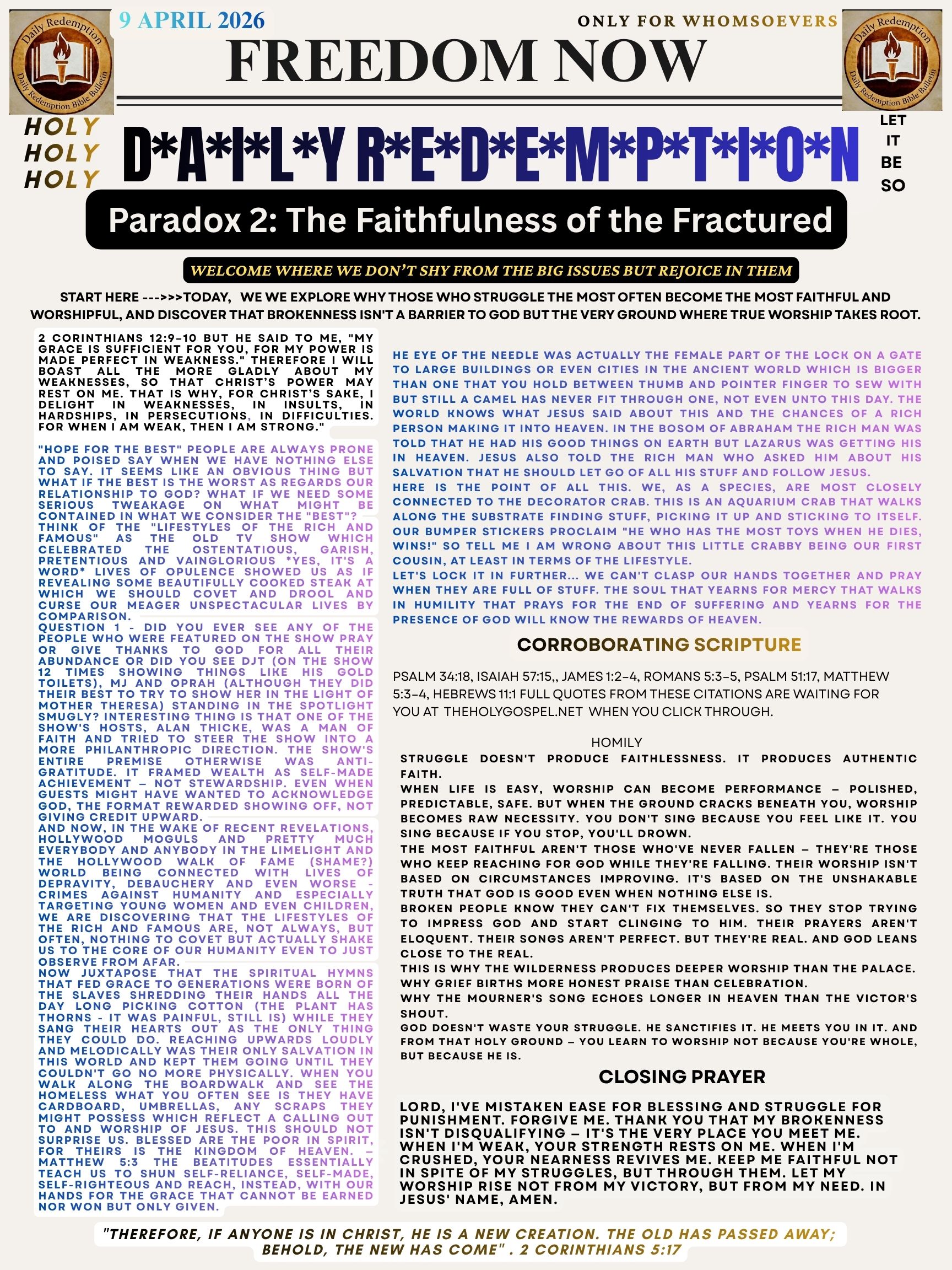 Welcome to today’s Daily Redemption — where we explore why those who struggle the most often become the most faithful and worshipful, and discover that brokenness isn’t a barrier to God but the very ground where true worship takes root.
