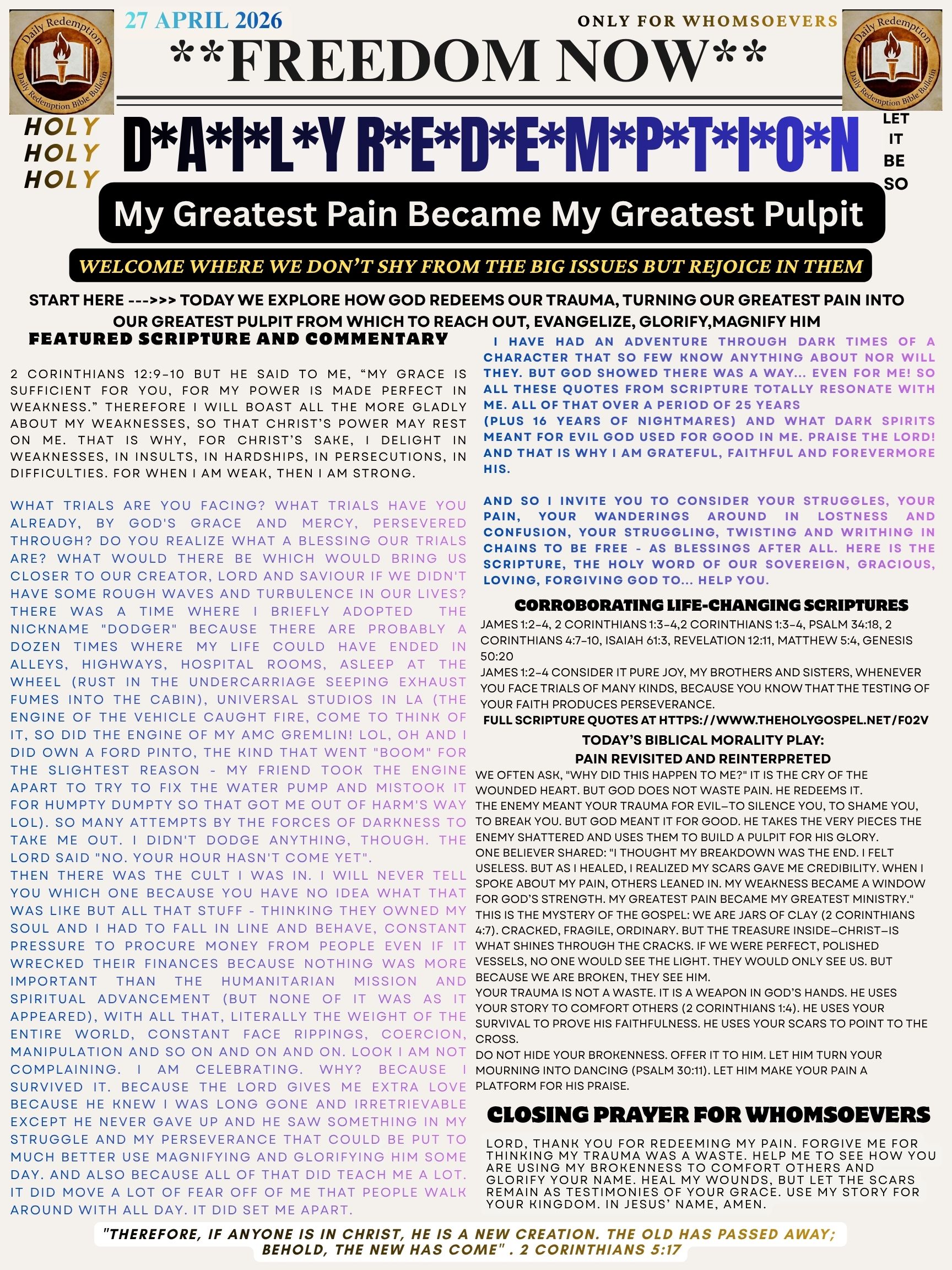 Welcome to Today’s Daily Redemption Bible Blast Bulletin! Today we explore how God redeems our trauma, turning our greatest pain into OUR greatest pulpit from which to reach out, evangelize, glorify,magnify Him